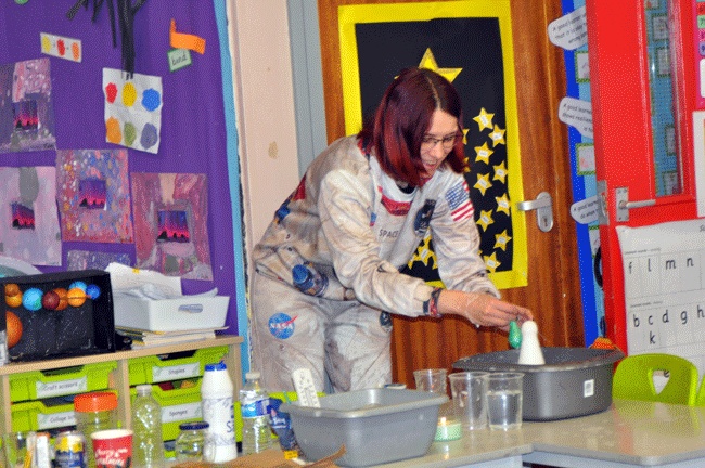 This morning a scientist came to visit the Year 2 children. She demonstrated some experiments, including making a ‘volcano’, chatted about which materials are better for the environment, and told them about a few extraordinary inventions made by children. One of these was about a six year old boy from Hampshire, who collected more than 2,500 confectionery tubs from landfill to make outdoor furniture including benches.
